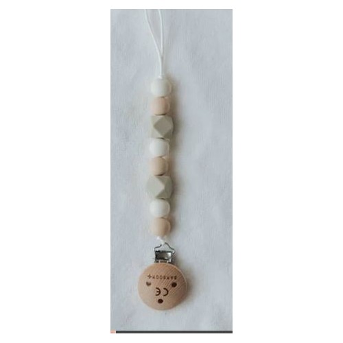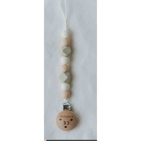 Un elegante portaciuccio realizzato in silicone: è dotato di una pratica clip in legno per appenderlo ai vestiti del tuo bimbo ed è realizzato con colori neutri che ti permettono di abbinarlo facilmente all'abbigliamento!